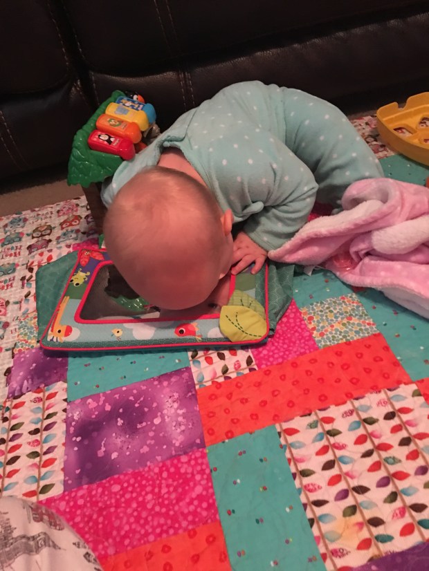 She is almost crawling! Right now it’s more like a scoot. Her back legs take steps, but she hasn’t figured out how to make her arms move without falling. But at the rate she has learned things this month I’m sure we are just days away from her crawling!