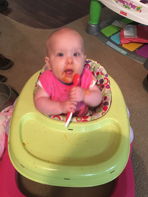 She may be a little bit more like her momma than I realized… She is still nursing and loves her baby food! Her favorites right now are apples, bananas and sweet potatoes!