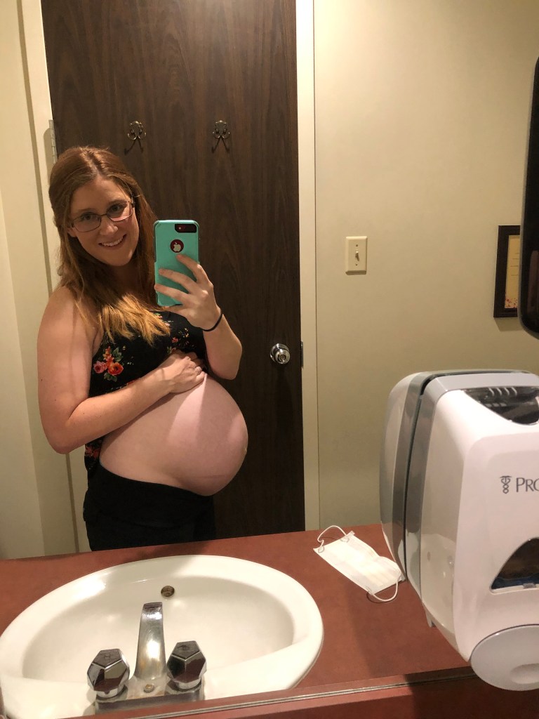 We went in for our ultrasound, which was kind of exciting because the last ultrasound Brad had been allowed to attend was our gender ultrasound at 13 weeks. The tech was super nice and took all of the measurements that the doctor needed. She told us baby looked healthy and was measuring around 6lb 5oz. She also confirmed that there was plenty of fluid left but that our baby’s head was measuring around the size of a 36 week baby.