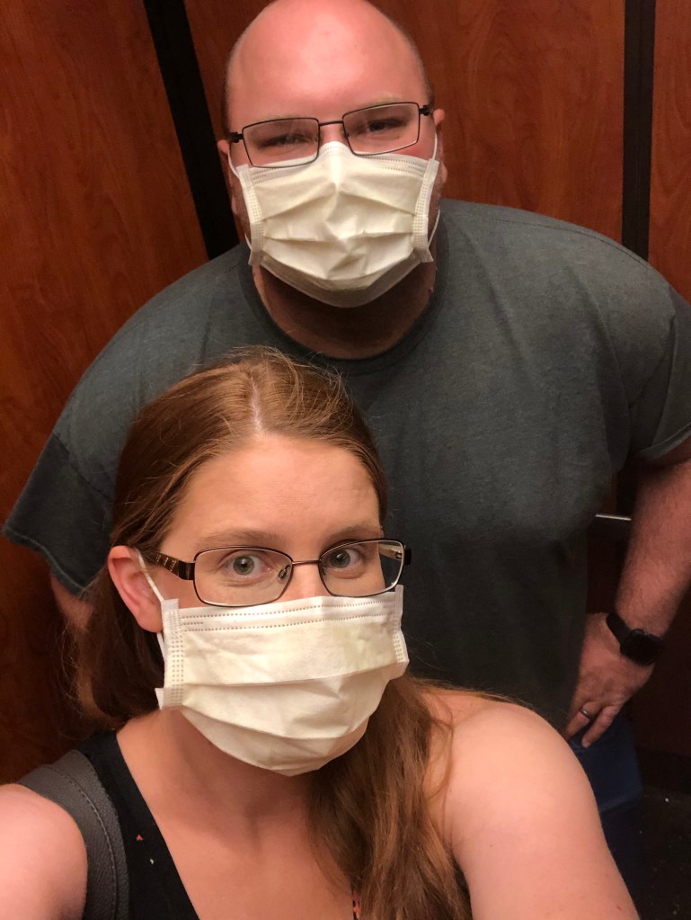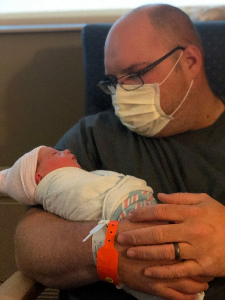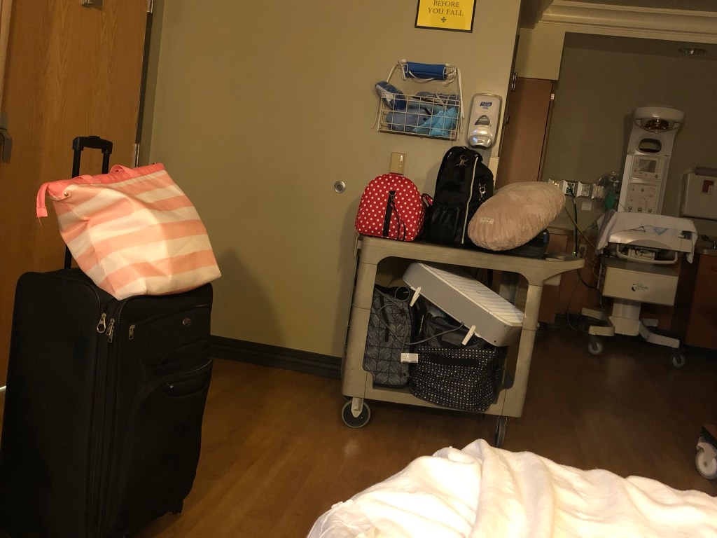 After a while, the door opened and Bradley came in holding bags and pulling a cart loaded up with more bags. He ripped off his mask and was dripping sweat. Wow.. I didn’t realize I had packed so many bags… Poor thing had to drag it all around the hospital to get to an entrance that was open so he could get back in since it was after 8pm.
